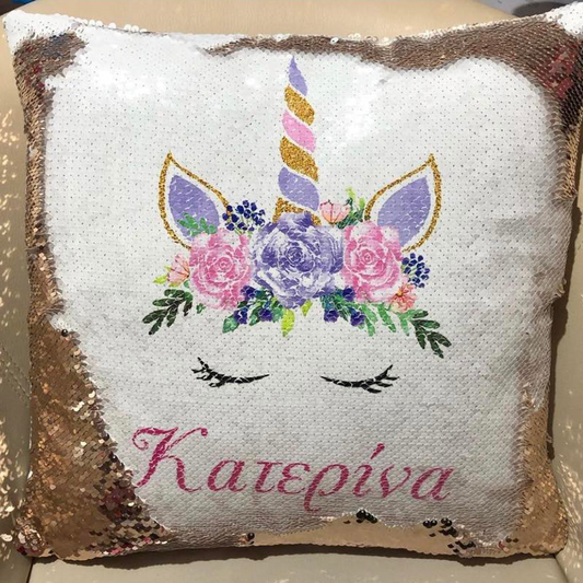 Μαξιλάρι με xρυσές πούλιες με εκτύπωση στην λευκή πλευρά